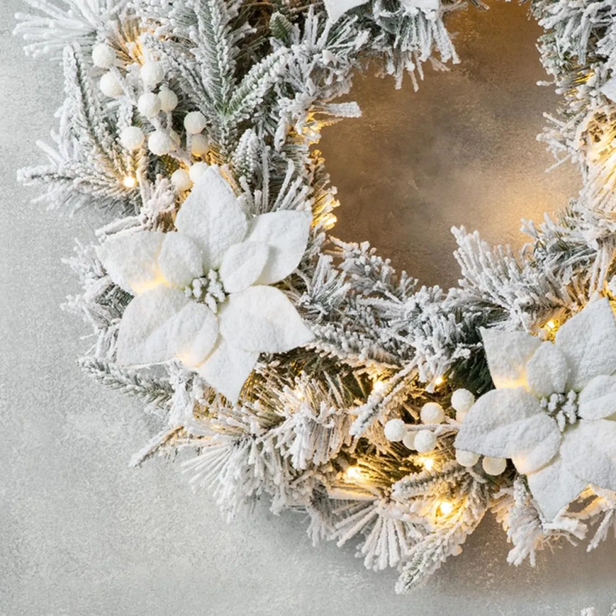 This Snow Flocked Christmas Wreath Is Crafted With Pine Needle Tips, Poinsettia, And White Berries. It Will Add A Touch Of Charming Light And Cheer To Your Front Door Or Window During Your Holiday Season.