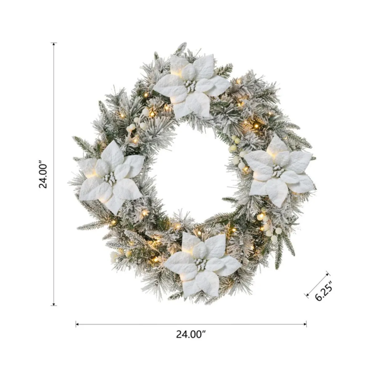 Glitzhome 24″ D Led Flocked Greenery Pine Poinsettia Christmas Wreath