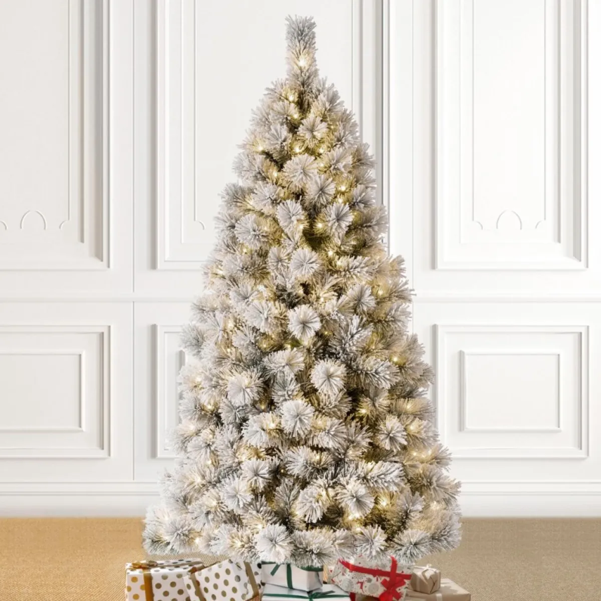 This 6Ft. Pre-Lit Snow Flocked Christmas Tree Creates A Unique Wintery Feel, And Will Be An Eye-Catching Addition To Any Room During The Christmas Holidays. Features A Traditional, Full Silhouette With Lifelike Foliage And Flocked Finish. Product May Ship Compressed. You Can Adjust All The Branches For An Elegant Look Like The Images.