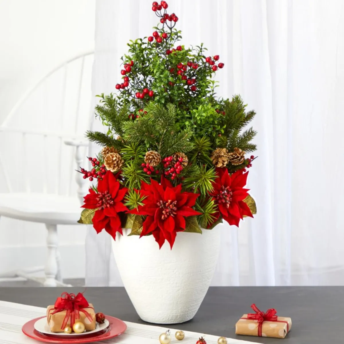 Showcase Seasonal Cheer Throughout The Winter Holidays With The Help Of This Extraordinary Artificial Arrangement Composed Of Various Faux Succulents And Mixed Greens, Handsomely Highlighted With A Collection Of Seasonal Favorites: Poinsettia, Berry, And Pine; Each Bringing An Eclectic Mix Of Holiday Colors And Textures To Empty Spaces. Standing 32″ High From A White Vase, This Winter-Inspired Fake Arrangement Would Make A Fine Holiday Gift. Materials:Glue, Moss, Fiber Clay, Styrofoam, Iron Wire, Plastic, Polyester Materials Dimensions:H: 32 In. W: 16 In. D: 16 In